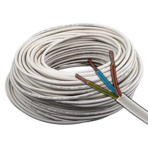 Rugalmas, kerek kivitelű, fehér PVC-köpenyű kábel, amely három egymástól külön szigetelt, finomsodratú, csupasz réz eret foglal magába köztük a zöld/sárga védővezetőt (PE). A lángterjedést gátló PVC érszigetelést robusztus, sima külső köpeny óvja (CPR tűzosztály Eca, EN 60332-1-2), így megbízható választás háztartási kisgépek, hosszabbítók, világítótestek és egyéb beltéri fogyasztók fix betáplálásához.