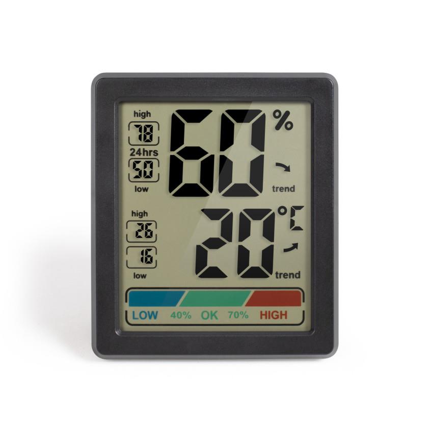 Beltéri hőmérő és higrométerHőmérő °C/°FMemória a minimális és maximális hőmérséklet és páratartalom tárolásáraPáratartalom kijelzés: alacsony, normál, magasHőmérséklet és páratartalom trendjelzőHőmérséklet-tartomány: -10°C és +70°C közöttPáratartalom: 20% és 95% közöttKépernyőméret: 7,7 x 6,5 cmFalra szerelhető vagy levehető állvány
